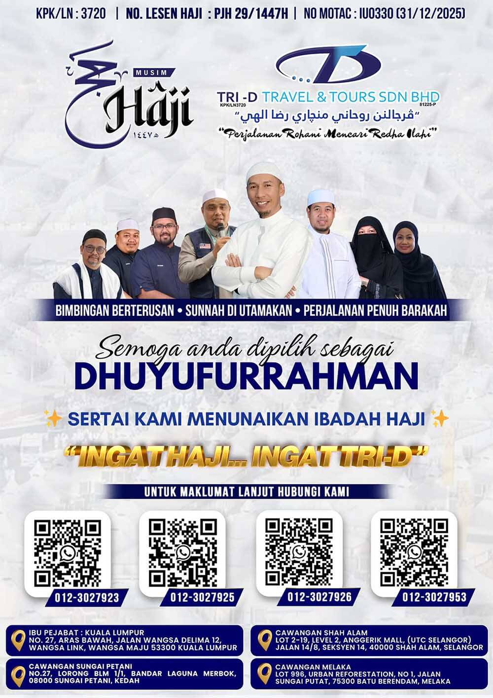 Tri-D Travel & Tours Sdn Bhd, juga telah diberikan lesen sebagai Pengelola Jemaah Haji (PJH) bermula dari tahun 2018 oleh pihak Lembaga Tabung Haji. Mempunyai Pembimbing Haji serta barisan Mutawwif berpengalaman dalam menyantuni para Duyufurrahman bagi Musim Haji 1447H / 2026M.