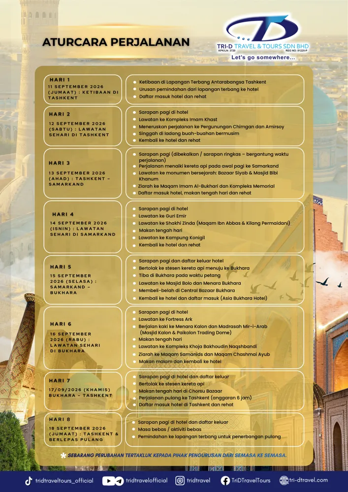 HARI 8 – 18 SEPTEMBER 2026 (JUMAAT): TASHKENT & BERLEPAS PULANG